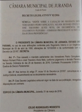 A Câmara de Juranda não perdeu tempo, não. Na segunda-feira ficou esperando até chegar uma decisão favorável do Judiciário para poder votar a cassação de três vereadores. O trio acabou cassado por nove votos a zero. Nesta quarta-feira já saiu publicada a portaria que oficializa a cassação de Pedro Gonçalves, Nelson Richard Pinto e José Theodoro Alves Neto. A portaria determina que a decisão seja comunicada à Justiça Eleitoral. Os três cassados já estavam afastados da Câmara desde novembro.