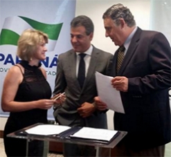 O governador Beto Richa e o presidente da Cohapar, Abelardo Lupion, assinaram nesta terça-feira, no Palácio Iguaçu, os contratos de prestação de serviço para a construção de 517 novas moradias populares em 11 municípios. Farol foi a única cidade da região incluída, com 27 unidades. Tudo em parceria com a Caixa Econômica Federal e prefeituras. A prefeita Angela Kraus participou e aproveitou para colocar em dia a conversa com o governador.
