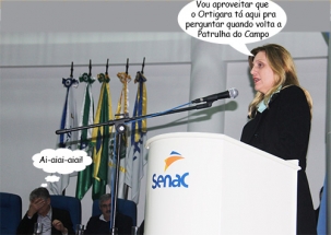 O clic é desta terça-feira, quando a Câmara fez sessão solene, no Senac, para entrega da Comenda 10 de Outubro para a Emater, que completou 60 anos. A prefeita Regian Dubay esteve por lá e discursou. Só não pergunte o que ela falou para que o secretário de Estado Norberto Ortigara (Agricultura) cobrisse o rosto dessa maneira...