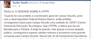O ex-prefeito Tauillo Tezelli também alfinetou a prefeita Regina Dubay ao responder, no Facebook, o vereador Pedrinho Nespolo.