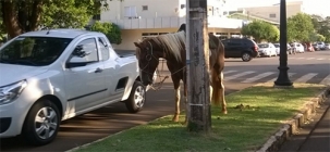 Quando a gente acha que já viu de tudo pelos canteiros centrais das avenidas de Campo Mourão, olha só o que aparece na av. Manoel Mendes de Camargo: um cavalo, amarrado a um poste. O flagra é destea quarta-feira. Foto: Rafael Silvestrin