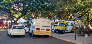 Nem a presença da Polícia Militar impede carro-forte de estacionar em local onde “veículo comum” não pode, no centro de Campo Mourão. Lei municipal proíbe esse “privilégio”, mas a cena ainda é muito comum.