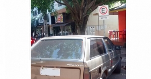 Em flagra neste sábado pela manhã, na rua Brasil, na quadra da prefeitura, carro estaciona bem em vaga de motocicletas.