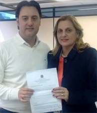 Olha ela aí repassando o documento para o secretário de Estado Ratinho Jr (Desenvolvimento Urbano).