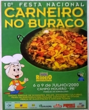 ...para o prato típico de Campo Mourão ser servido na 25ª Festa Nacional do Carneiro no Buraco. O cartaz ao lado é da 10ª edição do evento, que aconteceu em 9 de julho de 2000. Nos quatro dias, a festa incluiu, de novo, o “rodeio universitário” e anunciava a “gincana texana”.
