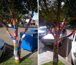 Você já viu árvores com troncos coloridos? Não? Então vá à esquina da rua Edmundo Mercer com a av. Manoel Mendes de Camargo. Todas as seis árvores que existem em frente ao edificio Athenas estão assim. E não é pintura, não. É crochê! Tudo feito sob medida. Cá pra nós: bem mais bonito que passar a motosserra e deixar a calçada pelada, né?...