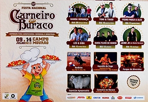 ...para o prato típico de Campo Mourão ser servido na 25ª Festa Nacional do Carneiro no Buraco. O cartaz de hoje é da 23ª edição do evento, realizada de 9 a 14 de julho de 2013. Foi a primeira festa da prefeita Regina Dubay. O cartaz destacava, entre outros, shows com Léo & Giba e banda Herança.
