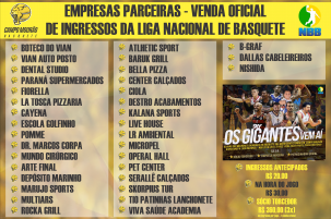 Campo Mourão Basquete divulgou a relação de empresas parceiras que venderão ingressos antecipados mais baratos para os jogos do NBB, que começa no mês que vem. São 25 empresas. O ingresso antecipado custará R$ 20 e somente será vendido por essas empresas. Na hora do jogo sairá por R$ 30.
