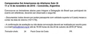 O técnico Paulo César Costa, de Campo Mourão, foi convocado pela Federação Brasileira de Atletismo para participar do Campeonato Sul-Americano de Atletismo sub-18, mês que vem, em Concórida (Argentina). Será o treinador-chefe. A convocação saiu nesta quarta-feira. A competição terá a presença de dois atletas de Campo Mourão.
