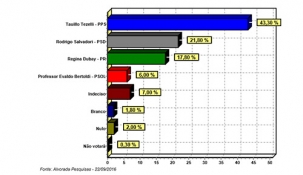 Ele ficou com 43,3% das intenções de voto, contra 21,8% de Rodrigo Salvadori, 17,8% de Regina Dubay e 6% de Professor Evaldo.