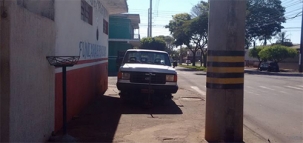 Na av. Jorge Walter, camionete sem os pneus é deixada sobre a calçada. É comum em Campo Mourão oficinas trabalharem sobre o passeio público.