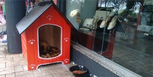 Cachorro de rua dorme em casinha no calçadão, centro de Campo Mourão. A casinha foi colocada por lojistas justamente para dar melhores condições de vida aos bichos abandonados. A prática vem crescendo pela cidade. Há lojas que colocam recipientes com água e ração para os cães que passam pelo local.