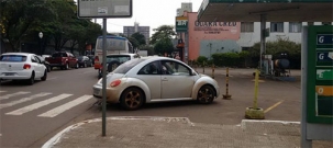 Ou: “E o pedestre, passa onde?”. Na av. Irmãos Pereira, centro de Campo Mourão, veículo aproveita a guia rebaixada de um posto de combustíveis desativado e estaciona atravessado sobre a calçada.