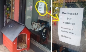 A gente já mostrou a casinha de cachorro que foi colocada no calçadão de Campo Mourão, entre as ruas Brasil e Harrison José Borges. É para a “Meninona”, uma simpática vira-latas que mora por ali. Agora, olha só o recado deixado na fachada da loja da frente. Tá pensando o quê! Como diria o narrador Rômulo Mendonça: “Aqui não, neném! Na nossa casinha, não!”...