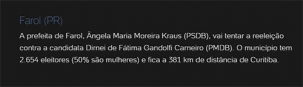 Uma é Farol, onde Angela Kraus e Dina Cardoso, prefeita e ex-prefeita, são as prefeitáveis.
