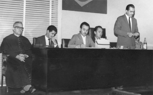 7 de fevereiro de 1968. Augustinho Vecchi (em pé) presta o juramento de posse em reunião extraordinária da Câmara de Vereadores. Na mesa: o bispo d. Eliseu Simões Mendes, o juiz Osíris Antônio Jesus Fontoura e Ephigênio José Carneiro (primeiro-secretário) e Alfonso Germano Hruschka (presidente). Vecchi assumia o cargo com a renúncia de Rosalino Salvadori que, por sua vez, tinha virado prefeito com a renúncia de Milton Luiz Pereira.