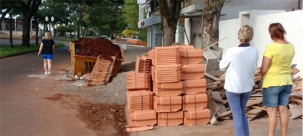 “Na av. Jorge Walter, centro de Campo Mourão, materiais de construção e entulho tomam conta da calçada e ao pedestre resta se arriscar andando pelo meio da via”.