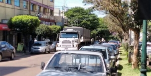 Carreta passa pela av. Irmãos Pereira, no centro de Campo Mourão. A cena é desta quinta-feira pela manhã.