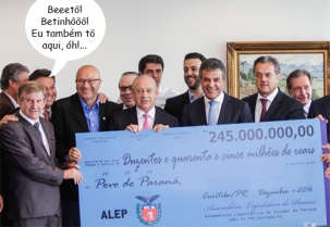 Deputados estaduais foram nesta quarta-feira ao Palácio Iguaçu fazer a devolução simbólica das economias da Assembleia Legislativa ao longo do ano. A Alep gastou R$ 245 milhões a menos do que poderia ter gastado. Entre os deputados que repassaram o checão ao governador Beto Richa estava o mourãoense Márcio Nunes. Ah, agora tem “os cinco milhão” pra Campo Mourão, não tem?...