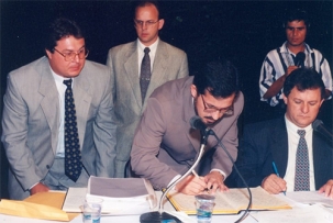 1º de janeiro de 1997. Tauillo Tezelli é empossado com prefeito de Campo Mourão em solenidade realizada, pela primeira vez, no Teatro Municipal. Na foto, o hoje deputado Márcio Nunes, que era o vice de Tauillo e, à direita, o veredor Edson Battilani, que tinha acabado de ser eleito presidente da Câmara. Ao fundo o advogado Luiz Alfredo (hoje vereador reeleito) e o radialista Nelson Silva.
