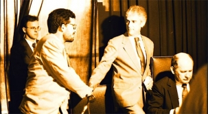 1º de janeiro de 1993. Posse do prefeito Rubens Bueno, realizada numa manhã ensolarada. O juramento de posse foi realizada na Câmara de Vereadores, que ficava dentro da prefeitura. Na foto, Bueno chega junto com o vice-prefeito Tauillo Tezelli. Ao lado, o vereador Luiz Carlos Kehl, que foi eleito presidente. Ao fundo, Luiz Alfredo, que na época era procurador da Câmara.