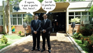O clic é do domingo, em Barbosa Ferraz. Depois de devidamente empossados pela Câmara, o prefeito Edenilson Miliossi e vice-prefeito Roni Móveis posaram para fotos em frente ao Paço Municipal. Segundo as “más línguas”, eles ficaram parecendo seguranças. Ô maldade...