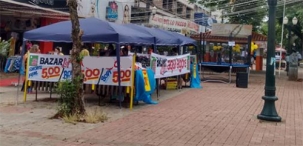 “Loja realiza bazar no calçadão, no centro de Campo Mourão. As bancas com os produtos em oferta foram montadas em plataformas colocadas em cima das floreiras”.