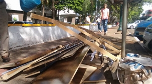 Desmontou um guarda-roupa velho e não sabe o que fazer com ele? Seus problemas acabaram. Basta jogar os pedaços em frente à prefeitura. É o Descarteichan System Tabajara. O moderno sistema foi usado nesta quinta-feira e os pedaços do móvel tomaram conta praticamente de toda a calçada, dificultando a passagem dos pedestres.