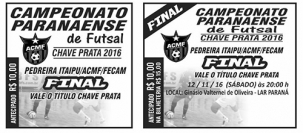 Estão à venda os ingressos para a final do Campeonato Paranaense de Futsal – Chave Prata entre Campo Mourão e Pato Branco. O primeiro jogo será neste sábado (20h), no ginásio do Lar Paraná. O ingresso antecipado custa R$ 10. Quem deixar para adquirir na hora do jogo vai pagar R$ 15. A ACMF já está garantida na Chave Ouro do ano que vem, mas briga agora pelo título da Prata. O segundo jogo da decisão será em Pato Branco, assim como o terceiro, se for necessário.