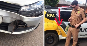 Olha só o que aconteceu em Goioerê na segunda-feira à tarde. O motorista de um Gol se distraiu quando trafegava pela av. Daniel Portelea e invadiu preferencial da av. Tiradentes. Resultado? Bateu o carro da empresa em que trabalha. Detalhe: bateu numa viatura da Polícia Militar. Foram só pequenos danos nos veículos, sem ninguém ferido. Mas tinha que ser justo numa viatura?...