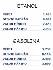 No etanol a variação é de R$ 0,34, indo de R$ 2,65 a R$ 2,99 (média de R$ 2,83).