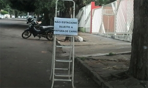 Está a fim de uma pintura no carro? Durante a pintura de casa na rua Harrison José Borges, colocaram uma escada para impedir que os carros estacionem no local. Tudo com o aviso: “Não estacione. Sujeito a pintura de carro”. Pelo visto, coitado do pedestre que passar por ali: sai colorizado. Foto.: Rafael Silvestrin