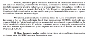 Segundo ela, sem provas concretas de que eventuais nomeações seriam abusivas, conceder liminar seria “temerário e abusivo”.