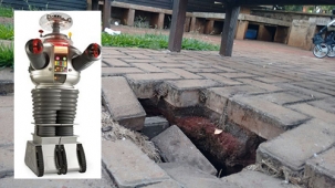 “Meus sensores indicam que é preciso tomar cuidado ao visitar o Recanto dos Tropeiros, ao lado do Museu Municipal, no centro de Campo Mourão. Parte do piso está cedendo e não se sabe ainda onde isso vai parar”. O alerta é do Robô, de “Perdidos no Espaço”, que deixou a família Robinson de lado e agora assessora Boca Santa.