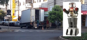Você vem pela av. Capitão Índio Bandeira (sentido Maringá-centro), vira pela rua São Paulo (sentido av. Manoel Mendes) e... dá de cara com um caminhão que se achou no direito de parar em fila dupla, praticamente na esquina, para fazer carga e descarga. Repare que o cone ficou quase em cima da faixa. Os sensores do Robô não tiveram dúvidas e dispararam o sinal de “perigo”.