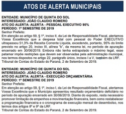 O Tribunal de Contas publicou nesta quarta-feira dois alertas para o prefeito de Quinta do Sol, João Cláudio Romero.