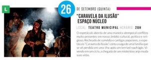..."Caravela da ilusão", do Espaço Núcleo, no Teatro Municipal (20h). Recheado de comédia e cantigas populares, o espetáculo conta a saga de uma família que se vê perdida em uma ilha após naufrágio. A chega de um misterioso anjo muda suas vidas". A entrada é gratuita. O Festival de Teatro de Campo Mourão segue até domingo.