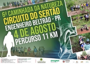 Engenheiro Beltrão realiza no próximo domingo a 6ª Caminhada Internacional na Natureza. O Circuito do Sertão tem 11 km entre trilhas e estradas rurais. A saída será no distrito de Sertãozinho, às 8h. A participação é gratuita, mas tem os opcionais de café da manhã (R$ 10) e almoço (R$ 20). Ainda este mês acontecerá a caminhada de Corumbataí do Sul, no dia 25 (Circuito Morros e Colinas).