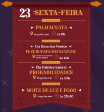 Sexta-feira recheada de atrações no Festival de Circo de Campo Mourão. Começa com "Palhaceata", às 9h, na praça São José. Às 15h tem espetáculo no Centro da Juventude e à noite as atenções voltam para a praça central, com espetáculo (20h) e a Noite de Luz e Fogo (21h30). O festival segue até domingo.