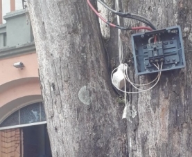 "Fios totalmente soltos e sem proteção nenhuma em árvore na praça São José, no centro de Campo Mourão".