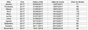 O Tribunal de Contas do Estado julgou regulares, com ressalva, as contas de 2017 da Câmara de Vereadores de Quarto Centenário. O presidente era Claudinei Carlis. A ressalva foi por atrasos no envio de informações ao sistema do TC. Houve atrasos todos os meses, como mostra o quadro acima. Alguns passaram de 170 dias. Carlis foi multado por causa disso. Ele pode recorrer.
