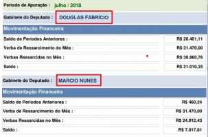 Saiu o relatório de despesas de julho dos gabinetes dos 54 deputados estaduais. Dos parlamentares da região, Douglas Fabricio teve gastos de R$ 30,8 mil, mas ainda conta com R$ 21 mil de sobras. Márcio Nunes gastou menos em julho - R$ 24,9 mil - , mas tem sobras menores - R$ 7 mil. Cada deputado tem direito a ressarcimento mensal de R$ 31,4 mil.