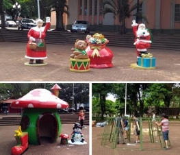 Chegaram as peças de decoração natalina que a Associação Sou Arte vai suar nas praças centrais de Campo Mourão. Tem presépio, tem Papai e Mamâe Noel, tem casinha de cogumelo, tem árvore de oito metros de altura, num total de 42 peças. A decoração faz parte da ambientação para os espetáculos que serão apresentados no local.