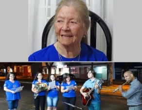 Funcionários da Biblioteca Municipal e da Casa da Música fizeram homenagem a dona Dornélia Lurdes Huber, de 82 anos.