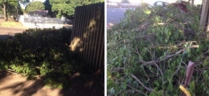 "Av. Guilherme de Paula Xavier, esquina do Colégio Estadual.Cortaram a árvore e deixaram na calçada, impedindo o trânsito de pedestres".