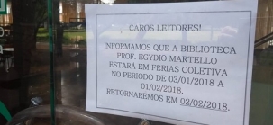 A série "recado na porta" hoje está na Biblioteca Municipal. Quem quiser ler alguma coisa no local ou emprestar livros terá de esperar até fevereiro. A biblioteca está em férias coletivas desde o início do mês e só reabre no próximo dia 2. Diferente do Arnesto, da música de Adoniran Barbosa, a Fundação Cultural deixou o "recado na porta" com essa informação. Mas que tem leitor com "uma baita de uma reiva", ah, isso tem...