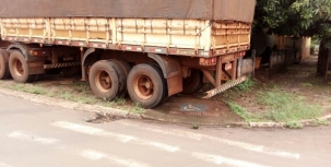 "Vocês já experimentaram andar pelas calçadas de Campo Mourão?" A pergunta do bispo d. Bruno Versari, em reunião da Acicam, continua mais atual que nunca. Olha só como a carreta estacionou na esquina da av. Manoel Mendes de Camargo com a rua Peabiru...