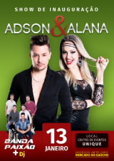 Show com a dupla Adson & Alana vai marcar, neste sábado, a reinauguração do Unique. O centro de eventos agora está sob o comando de Fernando Marcelo Turqueto. A ideia é promover um show por mês, além de bailões todos os domingo. Para a reinauguração, os convites antecipados podem ser comprados no Mercado do Gaúcho.