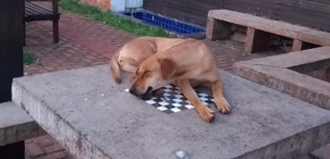 Cachorro dorme tranquilamente sobre mesa no Racanto do Tropeiro, ao lado do Museu Municipal.