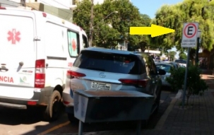 Rua Araruna, centro de Campo Mourão. Ambulância para em fila dupla porque carro usou a vaga dela, apesar da placa sinalizar que ali é exclusivo para ambulâncias.